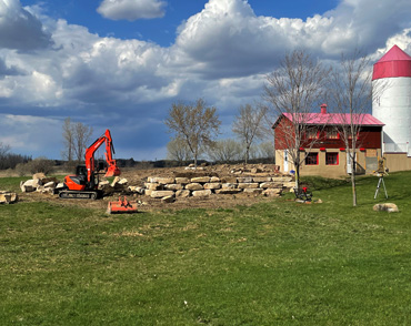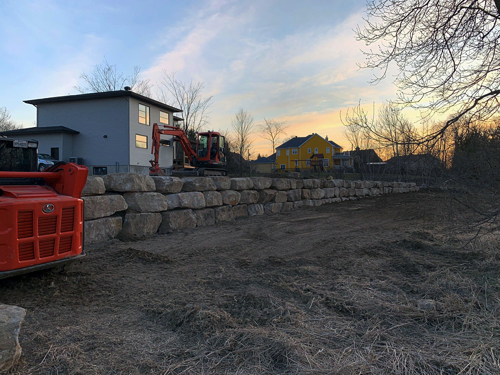 Construction d’un mur de soutènement en pierres naturelles et préparation pour dalle de béton, Oka.